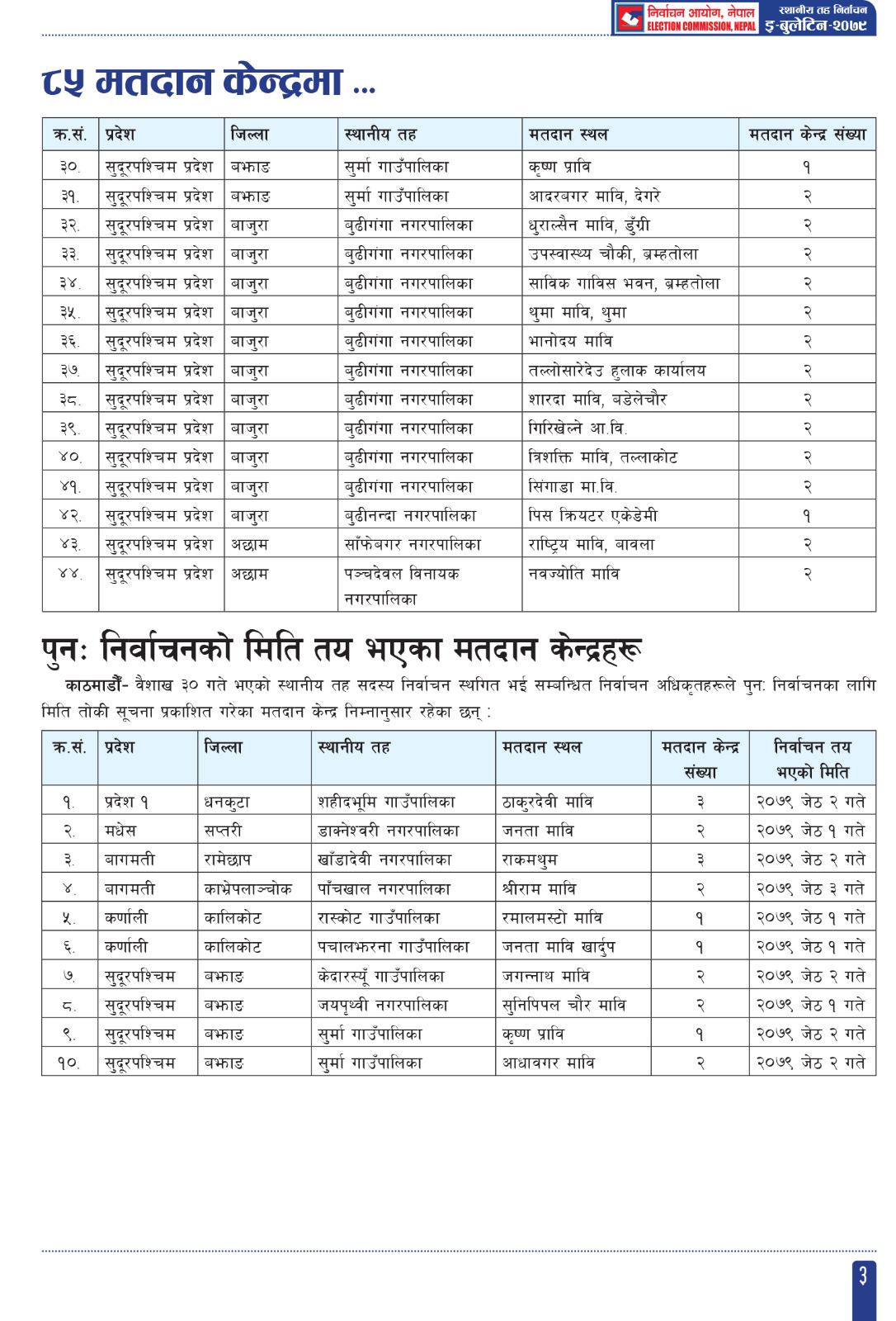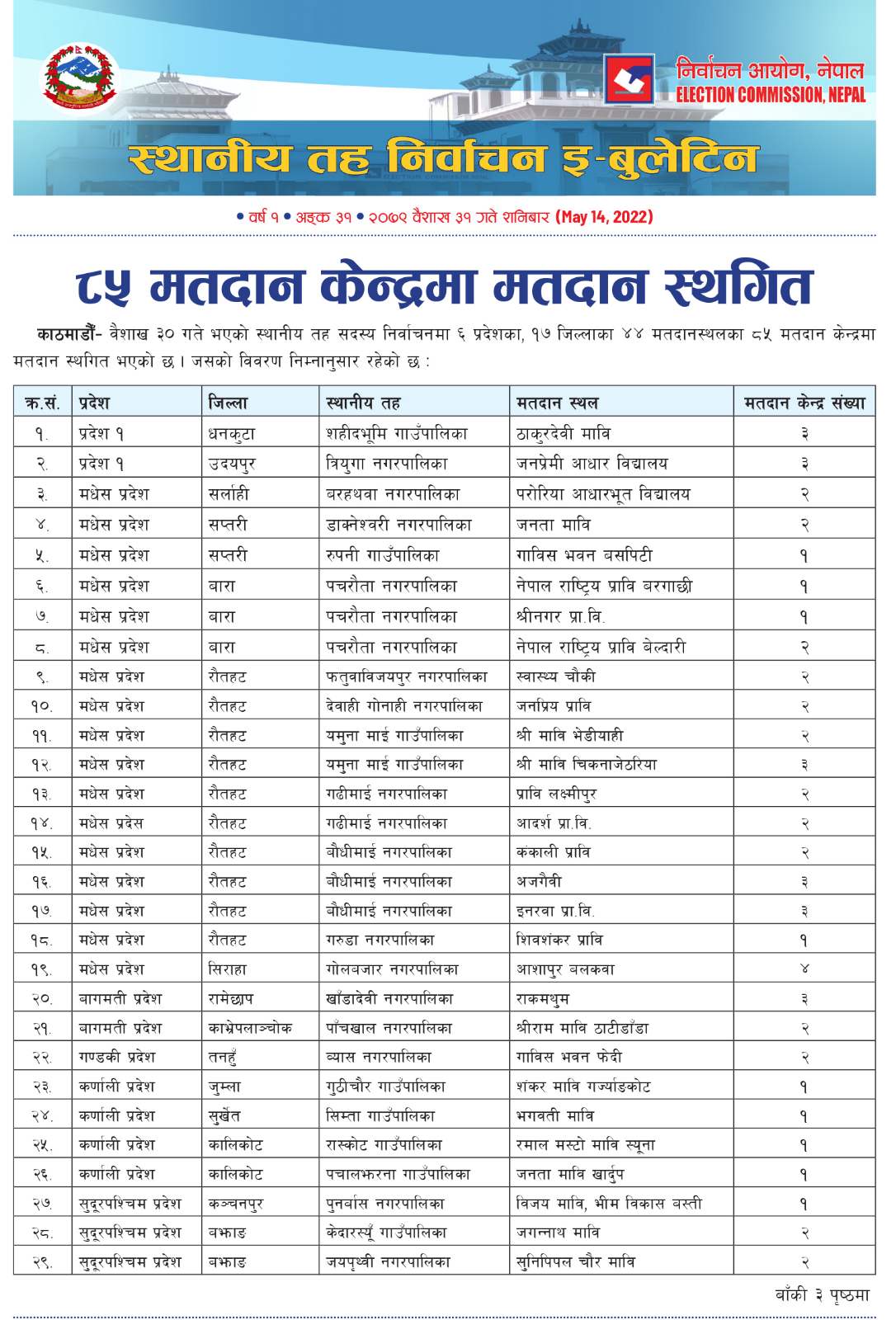 निर्वाचन आयोका अनुसार वैशाख ३० गते शुक्रबार भएको स्थानीय तह सदस्य निर्वाचनमा ६ प्रदेशका १७ जिल्लाका ४४ मतदानस्थलका ८५ मतदान केन्द्रमा मतदान स्थगित भएको छ ।