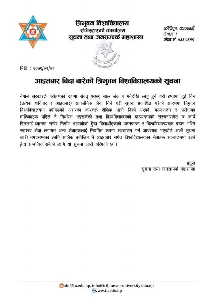 हप्तामा दुई दिन बिदा दिने सरकारको निर्णय त्रिविले नमान्ने (विज्ञप्तिसहित)
