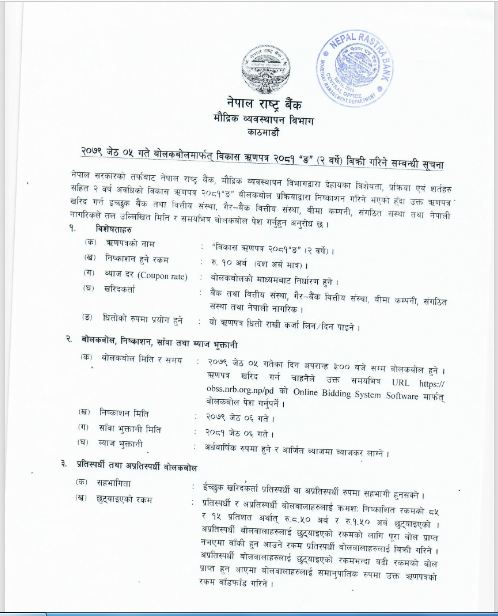 राष्ट्र बैंकका अनुसार दुईवर्षे अवधिको बिकास ऋणपत्र २०८१ ‘ङ’ (२ वर्षे) लाम दिएको उक्त ऋणपत्र खरिदको लागि बैंक तथा वित्तीय संस्था, गैरबैंक वित्तीय संस्था, बीमा कम्पनी, संगठित संस्था तथा नेपाली नागरिकले आवेदन दिन सक्नेछन् ।