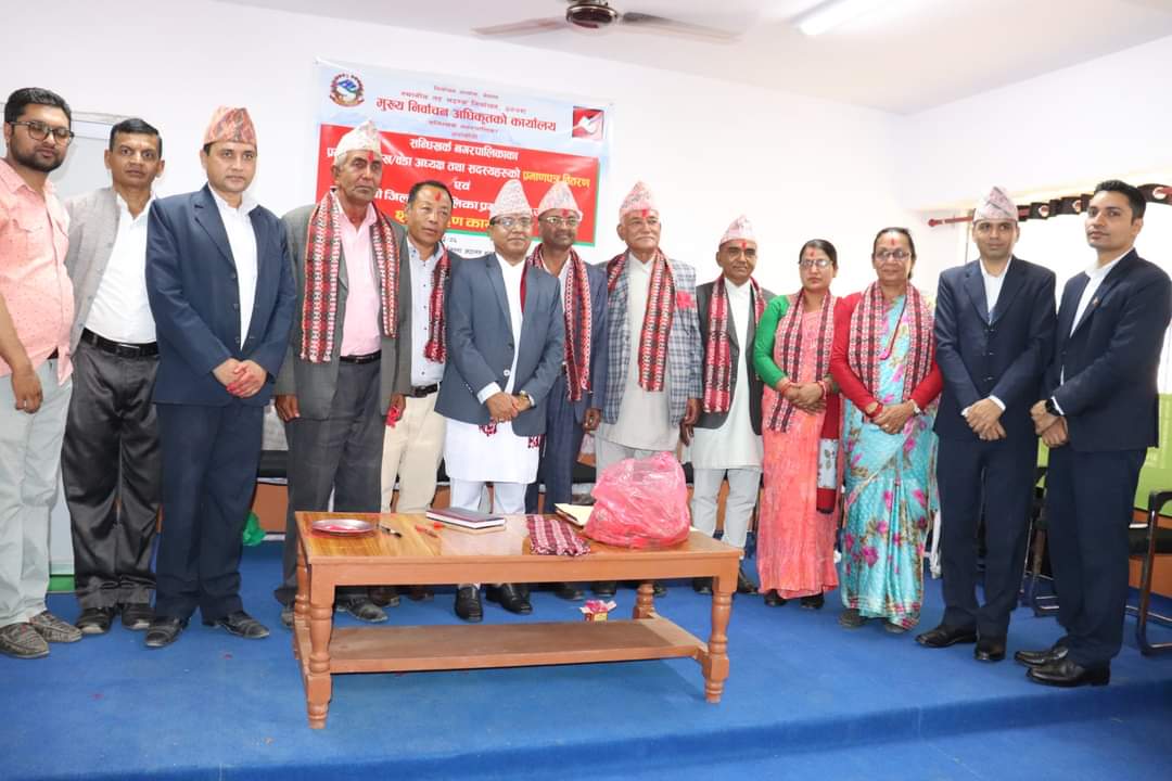 मुख्य निर्वाचन अधिकृतको कार्यालयमा आयोजना गरिएको विशेष समारोहमा जिल्ला न्यायाधीश बासुदेव न्यौपानेले नगपालिकाका प्रमुख तथा गाउँपालिकाका अध्यक्षहरूलाई शुक्रबार पद तथा गोपनीयताको शपथग्रहण गराएका हुन् ।