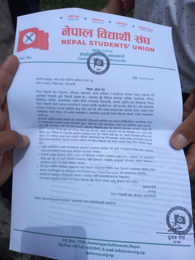 काठमाडौं । कांग्रेसनिकट विद्यार्थी संगठन नेविसंघले बलात्कारसम्बन्धी हदम्यादको व्यवस्था संशोधनको माग राखेर सरकारलाई ज्ञापनपत्र बुझाएको छ ।