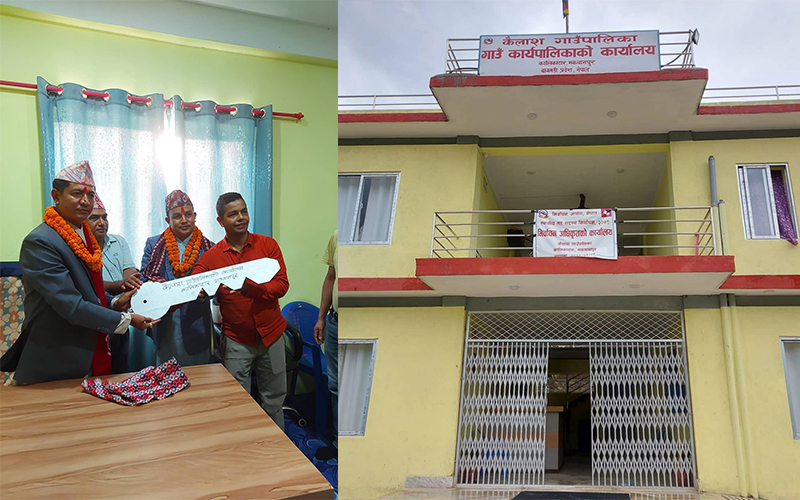 हेटौंडा । मकवानपुर जिल्लाको कैलाश गाउँपालिकाको नवनिर्मित प्रशासनिक भवन हस्तान्तरण गरिएको छ । रविना/अविषा जेभी निर्माण कम्पनीले गाउँपालिकाका अध्यक्ष लोकबहादुर मुक्तानलाई भवनको साँचो हस्तान्तरण गरेका हुन् ।