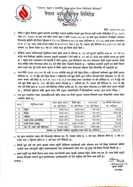 नेपाल आयल निगमले आज राति १२ बजेदेखि लागू हुनेगरी मूल्य वृद्धि गरेको हो ।
