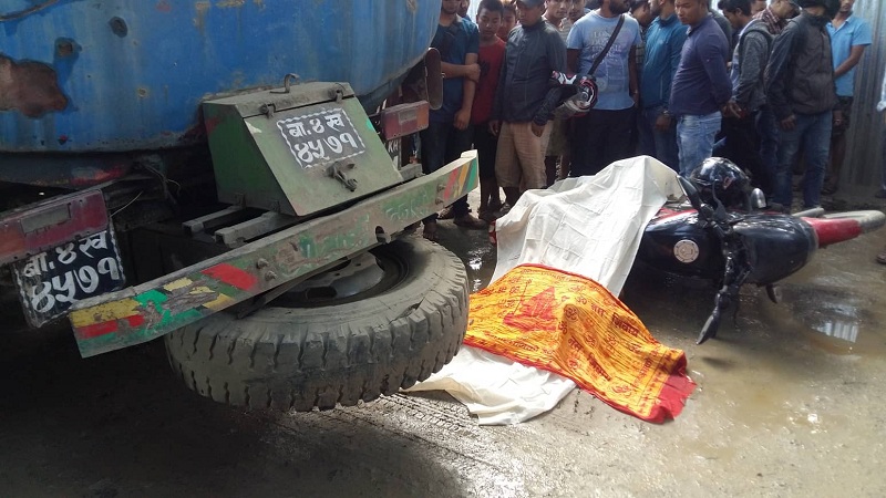 बा ४ ख ४५७१ नम्बरको पानि ट्यांकरले बिपरित दिशाबाट आउँदै गरेको बा ८१ प ५३७९ को मोटरसाइकललाई ठक्कर दिँदा ५० वर्षया नानिमाया महर्जनको मृत्यु भएको हो । ठक्करबाट अर्का एक जना सिकन्दर महर्जन भने सामान्य घाइते भएका छन् ।