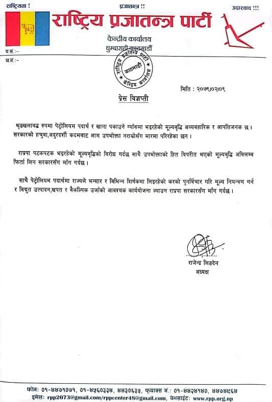 काठमाडौं । राष्ट्रिय प्रजातन्त्र पार्टी (राप्रपा)ले पेट्रोलियम पदार्थमा लगाइएको करमा पुनर्विचार गर्न आग्रह गरेको छ ।