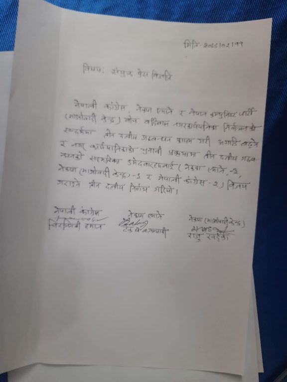 नगर कार्यपालिकाको ८ सदस्य निर्वाचनको लागि नेपाली कांग्रेस, नेकपा एमाले र माओवादी केन्द्रबीच गठबन्धन गर्ने सहमति भएको हो ।