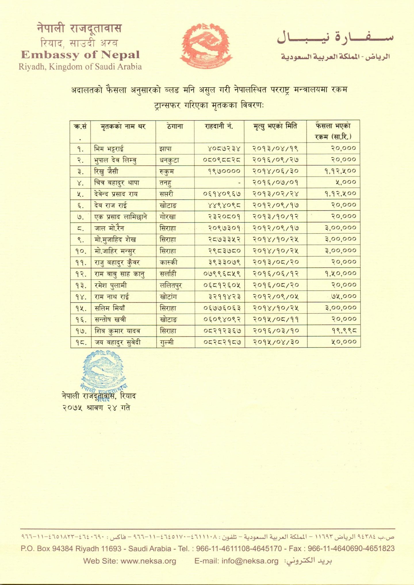 दूतावासले मुद्दा लडेर १८ जनाका परिवारलाई झन्डै ७ करोड रुपैयाँ ब्लडमनी दिलाएको हो ।