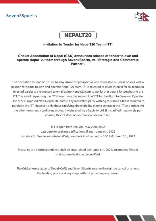 काठमाडौं । नेपाल क्रिकेट संघ (क्यान) ले आफ्नो आधिकारिक क्रिकेट लिग नेपाल टी-२० को टिम खरिदका लागि टेन्डर आह्वान गरेको छ ।