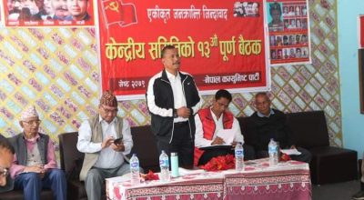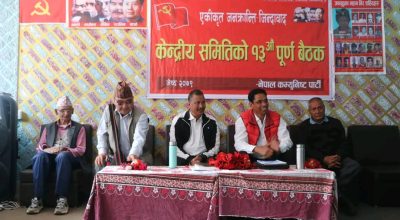 उदयपुर । नेत्रविक्रम चन्द विप्लव नेतृत्वको नेकपाको केन्द्रीय समिति विस्तारित बैठक उदयपुरको रौता पोखरीमा बिहीबारदेखि जारी छ । उदयपुरको रौतामाई गाउँपालिका– ६ स्थित रौता पोखरीमा महासचिव नेत्रविक्रम चन्द (विप्लव) को अध्यक्षतामा केन्द्रीय समितिको १३औं पूर्ण विस्तारित बैठक बसिरहेको हो ।