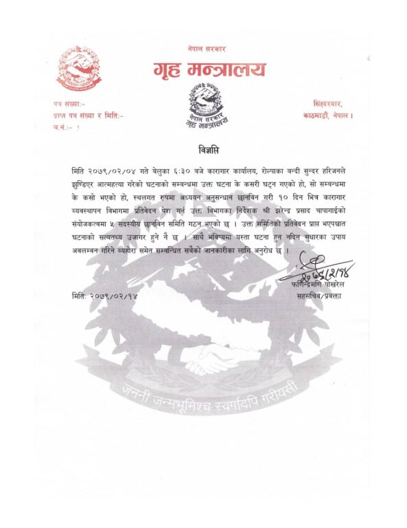 समितिलाई सो घटनाको छानविन गरी १० दिनभित्र कारागार व्यवस्थापन विभागमा प्रतिवेदन पेश गर्न गृहमन्त्रालयले जनाएको छ ।
