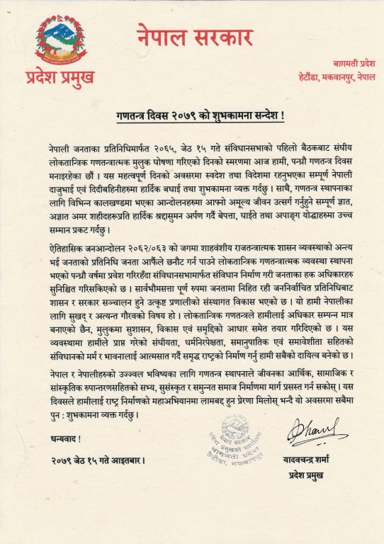 १५औँ गणतन्त्र दिवसका अवसरमा आइतबार शुभकामना सन्देश जारी गर्दै प्रदेश प्रमुख शर्माले लोकतान्त्रिक गणतन्त्रले हामीलाई अधिकार सम्पन्न मात्र नबनाई मुलुकमा सुशासन, विकास एवं समृद्दिको आधार समेत तयार गरिदिएको उल्लेख गरे ।