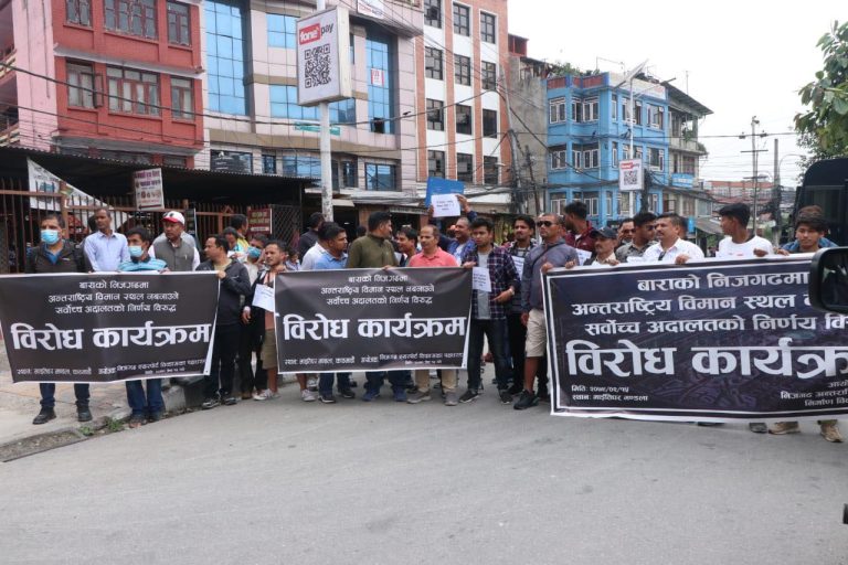 काठमाडौं । बाराको निजगढमा अन्तर्राष्ट्रिय विमानस्थद नबनाउन सर्वोच्च अदालतले दिएको आदेशविरुद्ध आइतबार पनि काठमाडौंमा विरोध प्रदर्शन भएको छ ।