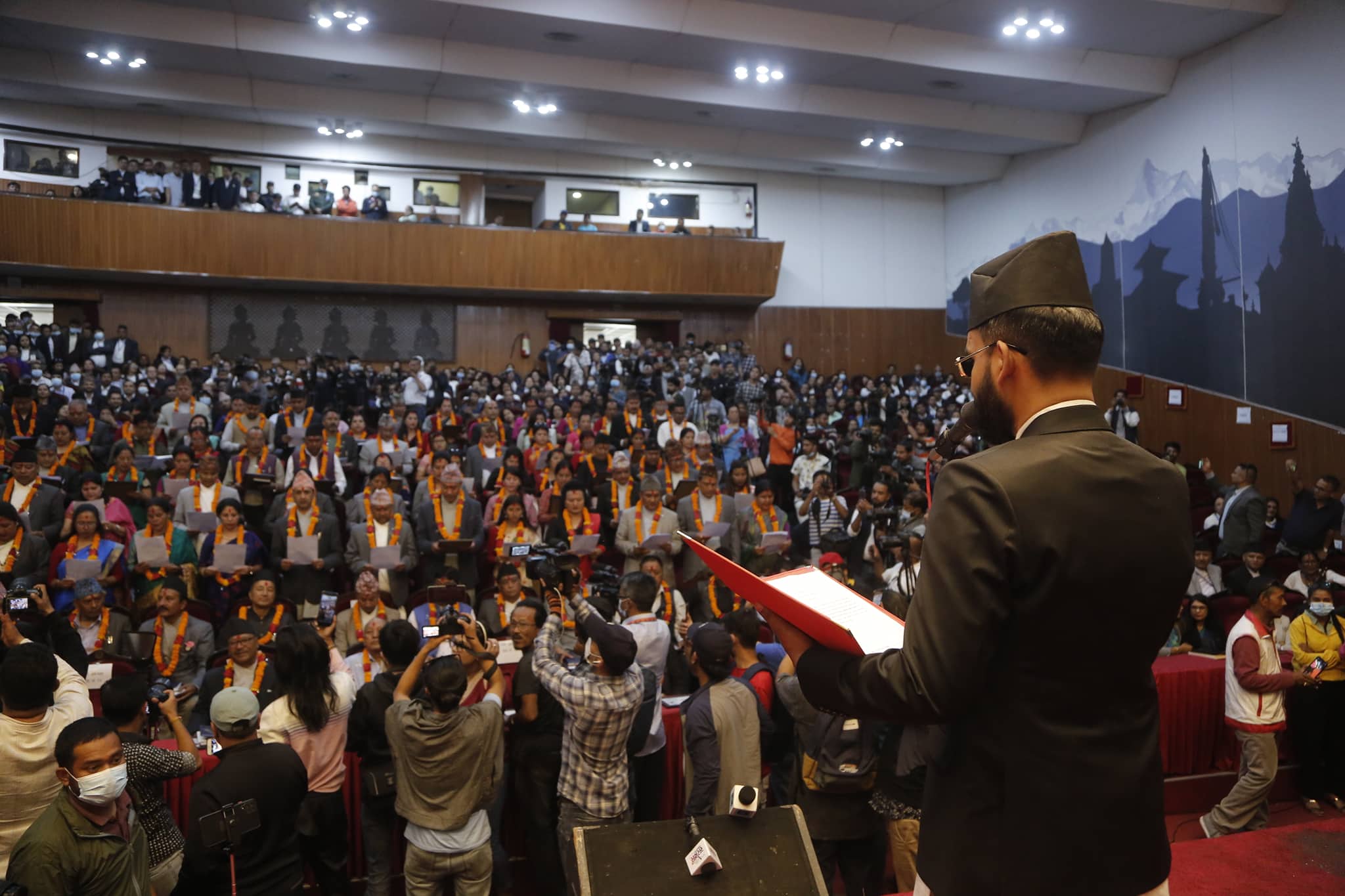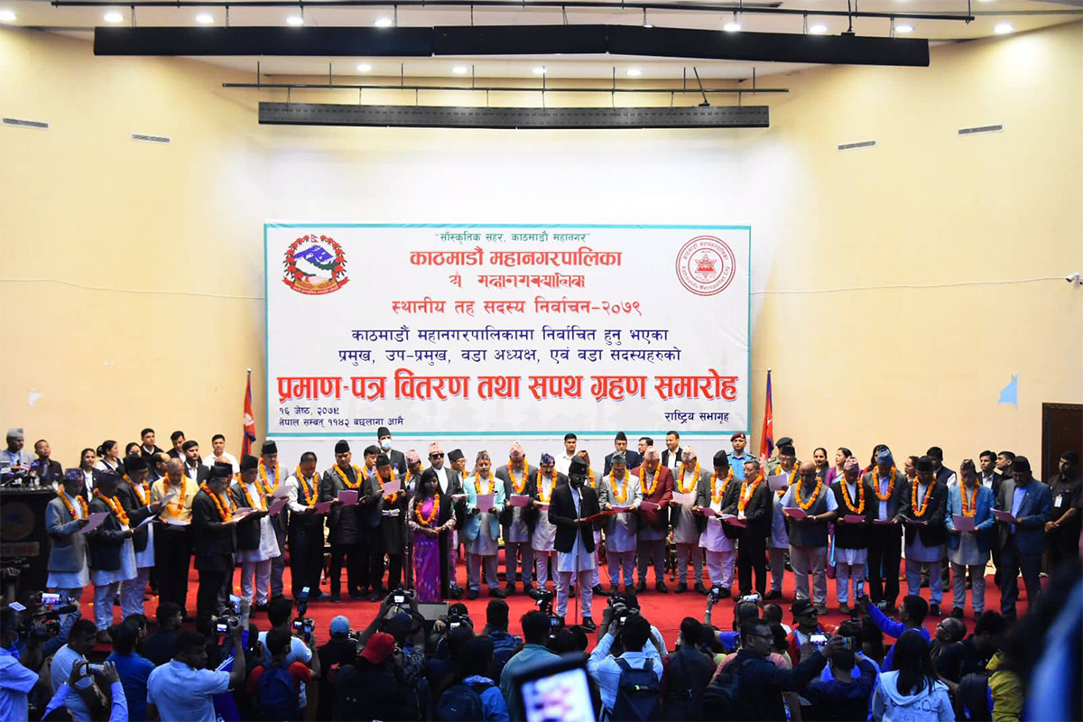 आज राष्ट्रिय सभागृहमा आयोजित कार्यक्रममा काठमाडौंका ३२ वटै वडाका निर्वाचित अध्यक्ष तथा सदस्यहरुले शपथग्रहण गरेका हुन् ।