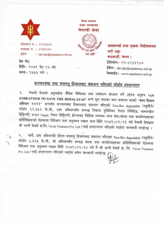 सेनाको अगुवाइमा जैविक विविधता तथा पर्यावरण संरक्षण गर्ने उद्देश्यले सञ्चालन भएको ‘सफा हिमाल अभियान २०२२ु अन्तर्गत कञ्चनजंघा र मनास्लु हिमालबाट संकलन गरिएको नकुहिने फोहर अभ्नी भेञ्चर्स प्रालिलाई हस्तान्तरण गरिएको नेपाली सेनाको जनसम्पर्क तथा सूचना निर्देशनालय जङ्गी अड्डाले जनाएको छ ।