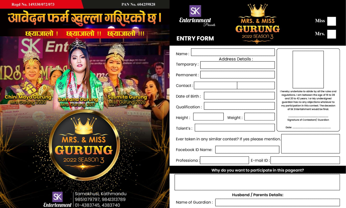 विगत ४ बर्षदेखि यस प्रतियोगिता आयोजना गर्दै आएको एस.के. इन्टरटेनमेन्ट प्रालिले ‘मिसेस एण्ड मिस गुरुङ -२०२२’ को अडिसन यहि आउदो जेठ २२ गते आइतबार हुने आयोजक संस्थाकि प्रबन्ध निर्देशक शान्ता तामाङले बताइन्। उक्त प्रतियोगिताको बिजेताले राष्ट्रिय तथा अन्तर्राष्ट्रियस्तरको प्रतियोगितामा भाग लिन पाउनेसहित चलचित्र, म्युजिक भिडियो, मिडिया अन्तरवार्तामा समेत सहभागिता हुन पाउनेछन्।