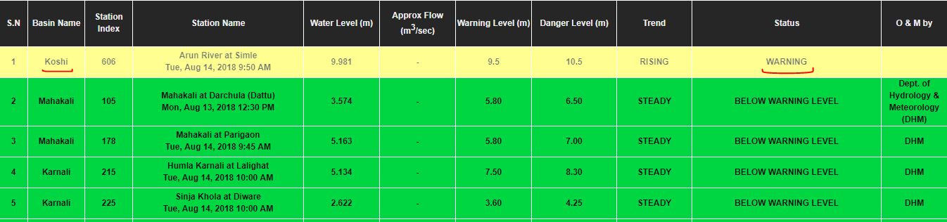 जल तथा माैसम विज्ञान विभागका अनुसार अहिले कोशीको सिम्लेमा पानीको सतह ९.७३ मिटर पुगेको छ । कोशीमा १०.५ मिटर उचार्इलार्इ सतर्कता तह मानिन्छ ।