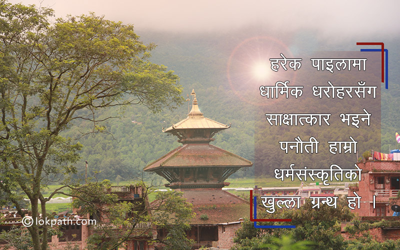 हरेक पाइलामा मन्दिर र धार्मिक महत्तवका धरोहरसँग साक्षात्कार भइने पनौती नगरपालिकालाई हाम्रो धर्मसंस्कृतिको खुल्ला ग्रन्थ भन्दा फरक नपर्ला ।