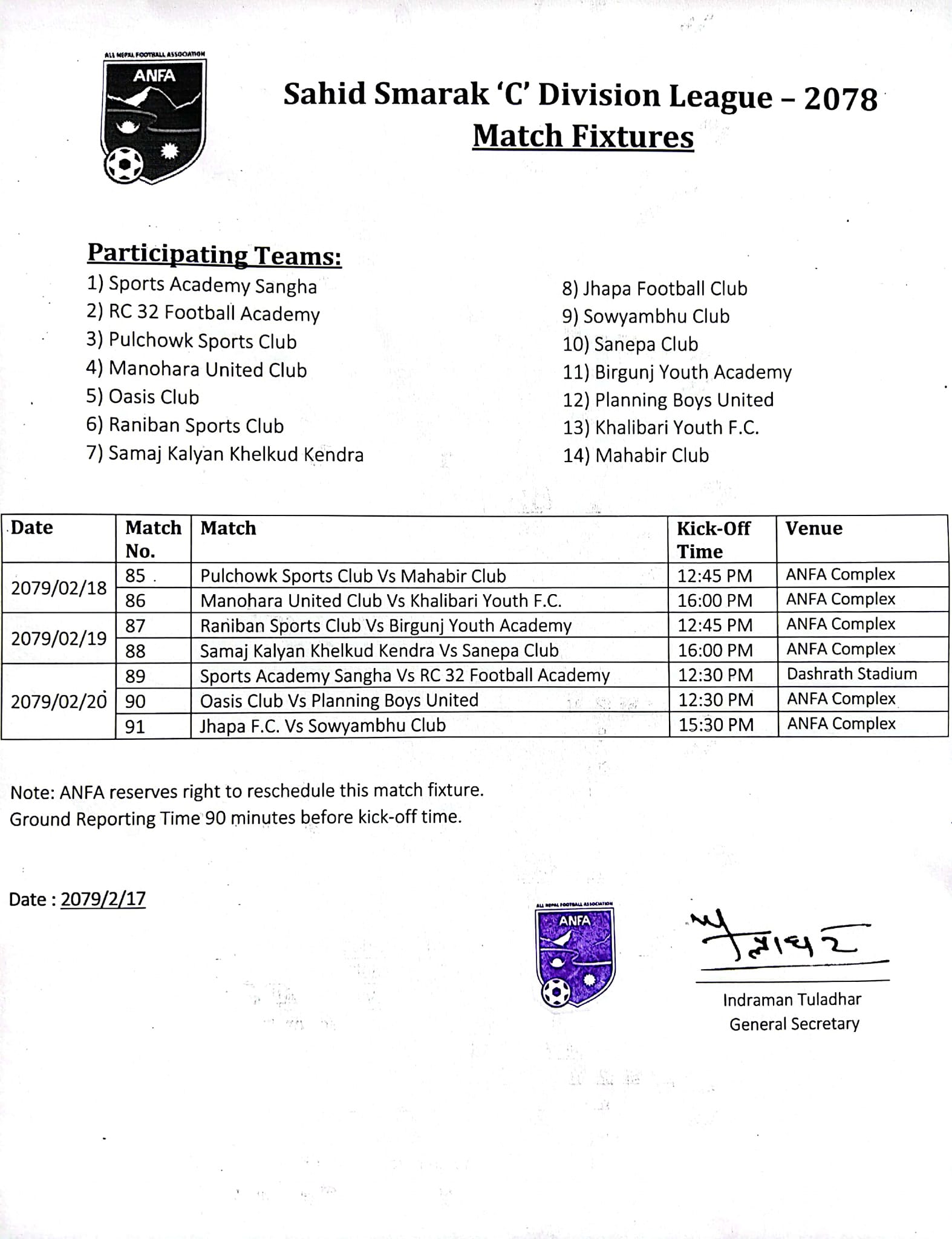 सी डिभिजन लिग : अन्तिम चरणको एक खेल दशरथ रंगशालामा हुने