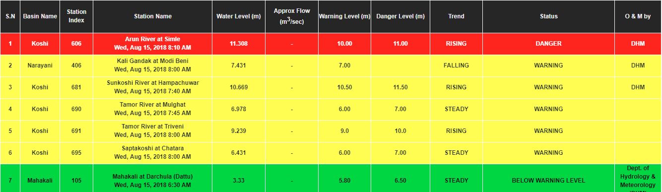 बाढी पूर्वानुमान शाखाका अनुसार यतिखेर देशका ६ वटा प्रमुख नदीहरूमा अाएको बाढीले खतराको संकेत नाघेका छन् ।