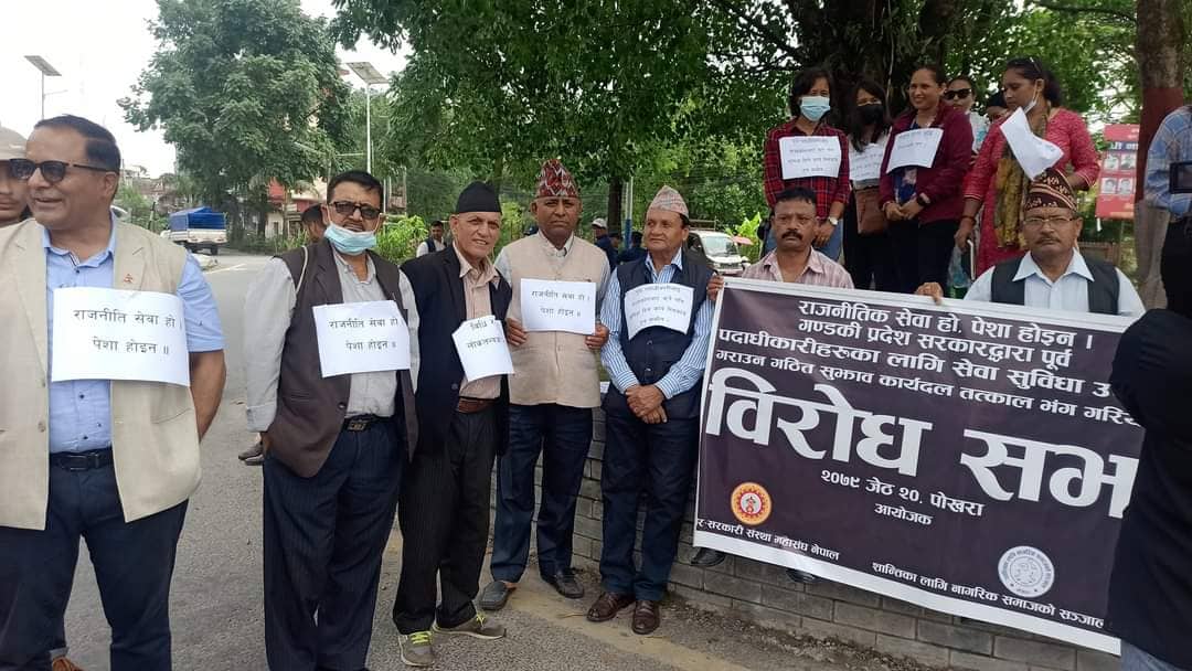 १२ जेठको मन्त्रिपरिषद बैठकले पूर्वपदाधिकारीलाई सुविधा दिन कानुन मस्यौदा समिति गठन गरेको छ । उक्त समिति गठन भएपछि समिति नै खारेजीको माग गर्दै विरोध कार्यक्रम गरिएको हो ।