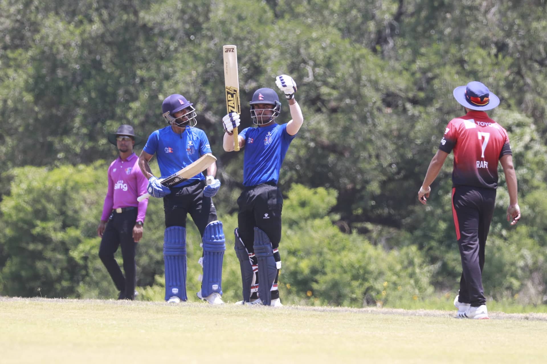 नेपालको ब्याटिङमा कप्तानी सम्हालेका रोहितले शतकीय इनिङ खेले । रोहितले ९० बलमा पाँच चौका र चार छक्कासहित एक सय एक रन बनाए । आरिफ सेखले ४१ रन बनाउँदा, देव खनालले १९, दीपेन्द्रसिंह ऐरीले २४, सुनिल धमलाले १३ र करण केसीले १२ रन बनाए ।