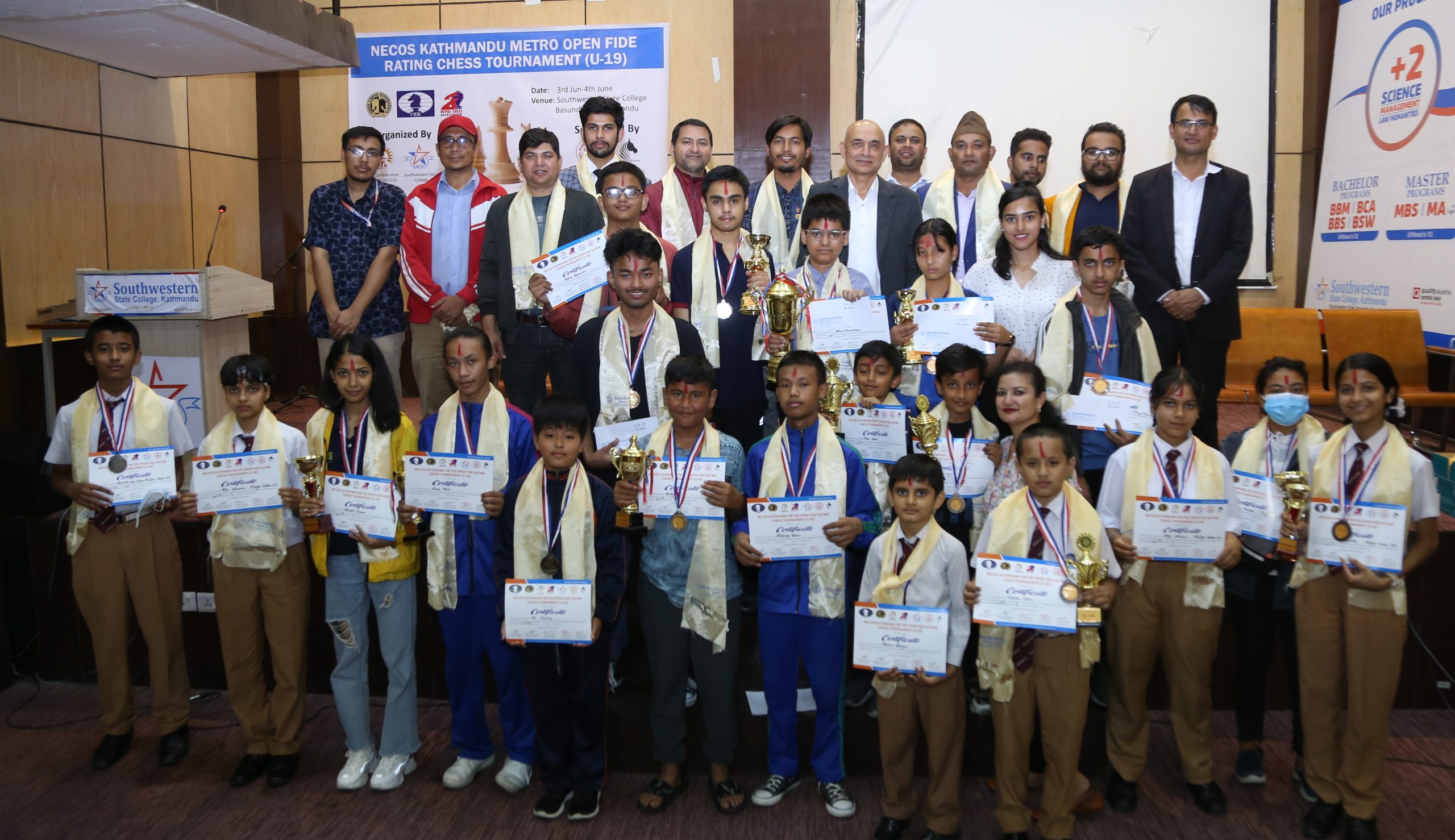 प्रतियोगिताका विजेता खेलाडीलाई नेपाल खेलकुद महासंघका स्कुल विभाग प्रमुख प्रभात विक्रम कटवाल, साउथ वेस्टर्न स्टेट कलेजका प्रिन्सिपल डा. राजेन्द्र केसी, नेपाल बुद्धिचाल संघका सदस्य अन्र्तराष्ट्रिय आर्विटर उमेश केसी, ईन्टरनेसनल मोटिभेसनल स्पीकर भुवन राज चतौट, नेकोसका केन्द्रिय सदस्य नवराज खरेल, प्रमुख आर्विटर उतम ढुंगेल, कार्यक्रम संयोजक मिसन बास्कोटा, साउथ वेस्टर्न स्टेट कलेजका प्रोग्राम कोर्डिनेटर राजेन्द्र प्रसाद लामिछाने, स्पोर्टस डिपार्टमेन्ट प्रमुख सुदर्शन जमकटेल लगायतले मेडल, सर्टिफिकेट तथा ट्रफी प्रदान गरे ।