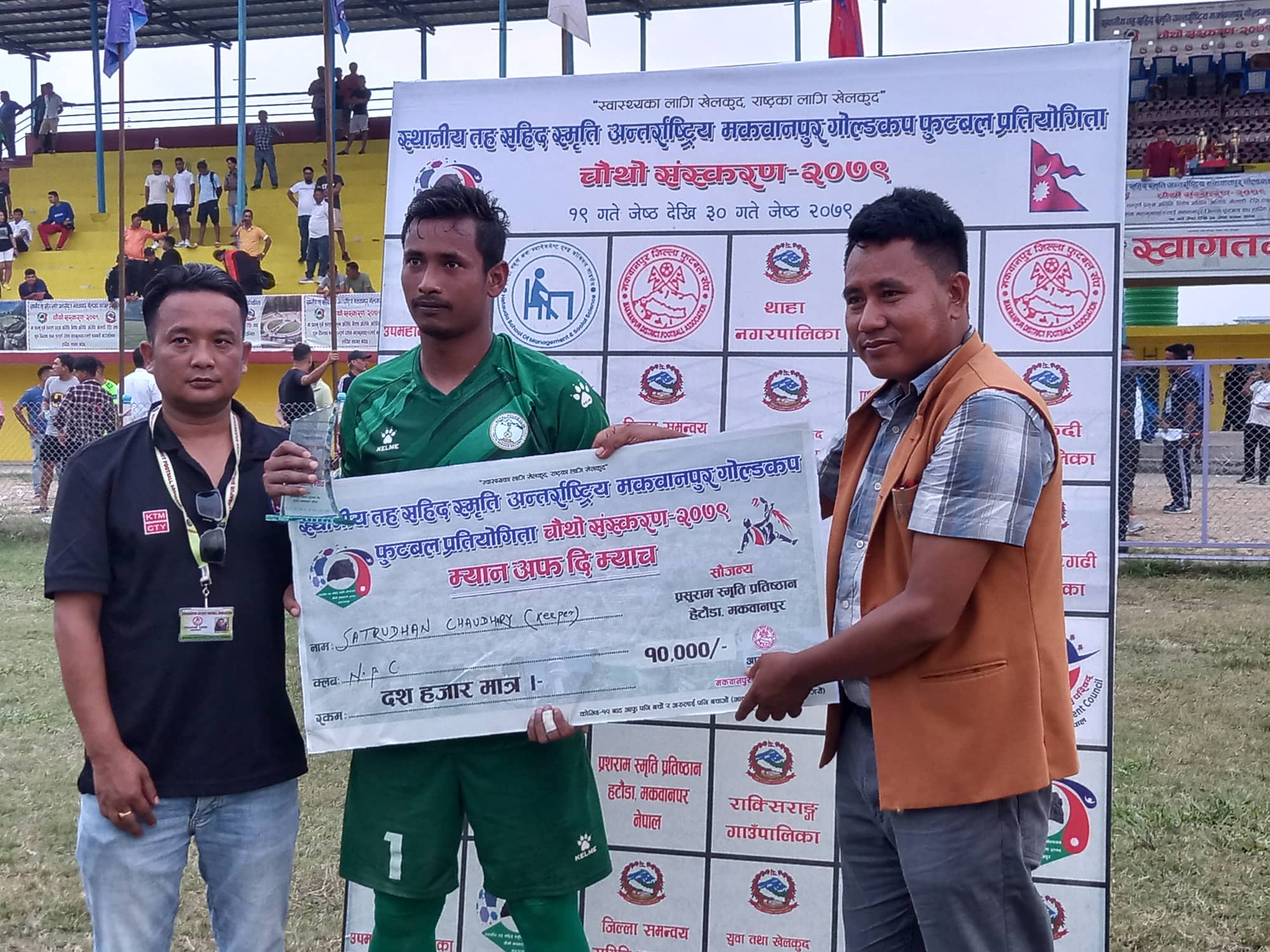 उनले नगद १० हजार रुपैयाँसहित ट्रफी प्राप्त गरे । जारी प्रतियोगितामा बुधबार मकवानपुरको विजय यूथ नव जनजागृति क्लव सिमराको खेल हुनेछ । मकवानपुर जिल्ला फुटबल संघको आयोजनामा सञ्चालन भैरहेको स्थानीय तह सहीद स्मृति मकवानपुर गोल्डकपको चौथो संस्करण यही बैशाख ३० गतेसम्म सञ्चालन हुनेछ ।