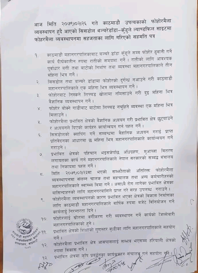 काठमाडौं महानगरपालिकाबाट बन्चरे डाँडा कुडुँलेलेसम्म फोहोर ढुवानी गर्ने कार्य दीर्घकालीन रुपमा रातिको समयमा गर्ने, रातिको समयमा आवाश्यक पूर्वाधार बत्ती तथा बाटोको निर्माण तथा व्यवस्थापन महानगरपालिकाले तीन महिनाभित्र गर्ने’ सहमतिपत्रमा उल्लेख छ, ‘सिसडोल तथा बन्चरे डाँडामा फोहोरको दुर्गन्ध नआउने गरी काठमाडौं महानगरपालिकाले एक महिनाभित्र व्यवस्थापन गर्नेलगायत सहमति भएकाे छ ।