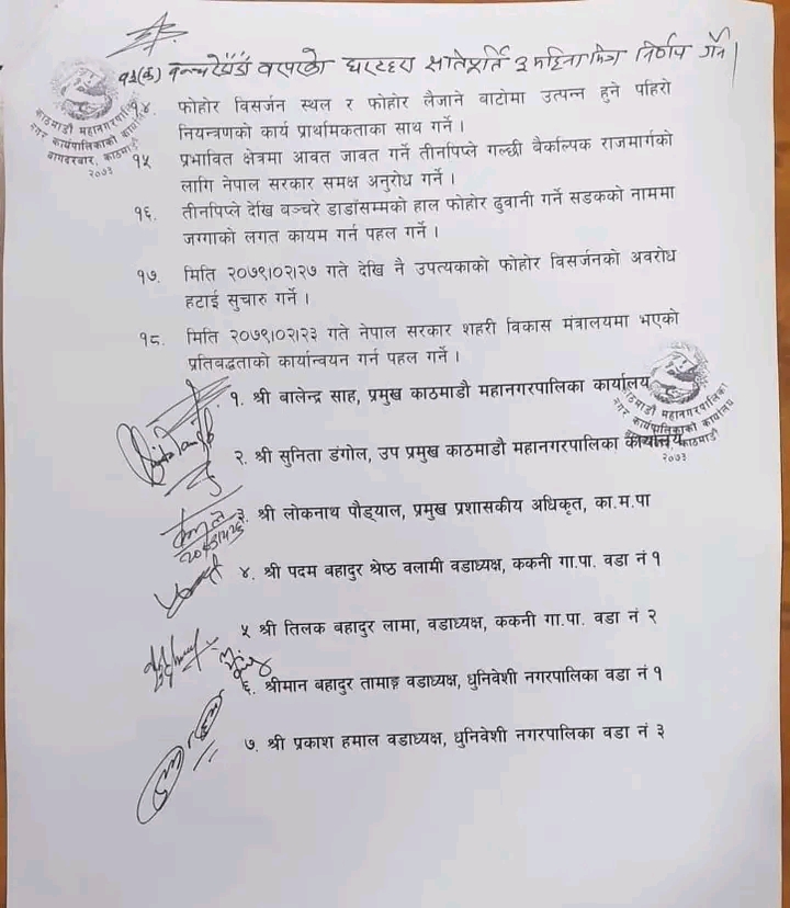 काठमाडौं । काठमाडौं उपत्यकाको फोहोरमैला व्यवस्थापनका बारेमा मध्यरातमा १८ बुँदे सहमति भएको छ ।