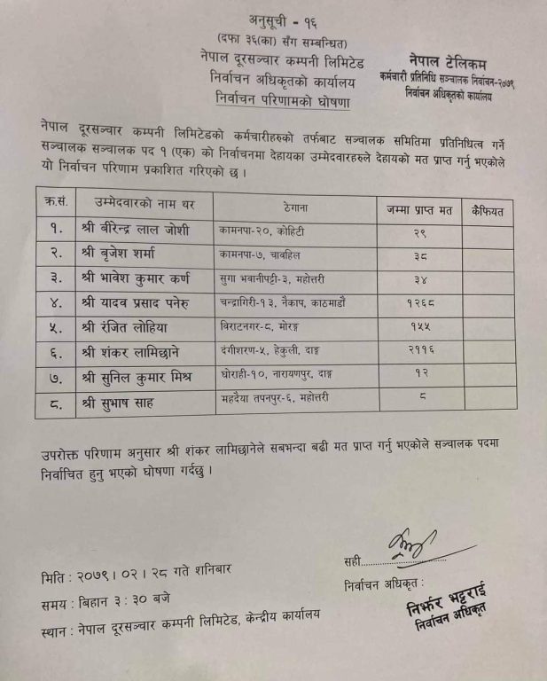 नेपाल दुरसञ्चार कम्पनी लिमिटेडको केन्द्रीय कार्यायलमा शनिबार भएको निर्वाचनमा उनी सबैभन्दा बढी मत प्राप्त गरी सञ्चालक पदमा निर्वाचित भएका हुन् ।