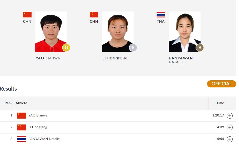 त्यस्तै, यो भन्दा मात्र ४ मिनेट ३९ सेकेन्ड पछाडी रेश पूरा गर्दै चीनकै हाङगफेङ लिले रजत तथा थाइल्याण्डकी नताली पान्यावानले कास्य पदक जितिन् ।