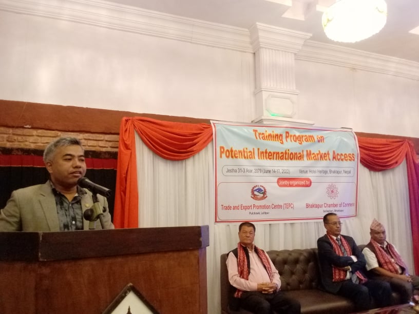 भक्तपुर चेम्बर अफ कमर्स र व्यापार तथा निकासी प्रवद्र्धन केन्द्र (टिइपिसी) को संयुक्त आयोजनामा सभ्वावित अन्तर्राष्ट्रिय बजार पहँच सम्बन्धी चारदिने तालिम उदघाटन कार्यक्रममा आयोजक भक्तपुर चेम्वरका अध्यक्ष न्हुछेरत्न मानन्धरले यही मनसायले तालिम सञ्चालन गरेको स्पष्ट पारे ।
