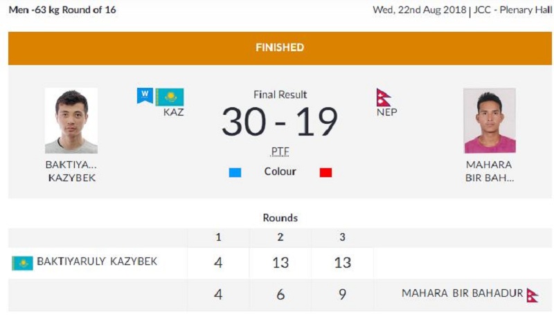 बुधवार भएको पुरुष ६३ केजी मुनी तौल समूहको खेलमा नेपालका महरा काजकिस्तानका काज्बेक बाक्तीयाश्लीरुसँग ३०-१९ अंकले पराजित हुँदै प्रतियोगिताबाट बाहिरिएका हुन् ।