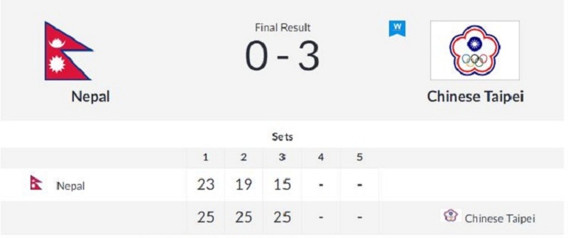 पहिलो सेट नेपालले २३-२५ स्कोरले गुमायो । त्यस्तै, दोस्रो सेटमा चाइनिज ताइपेइले नेपाली टोलीलाई २५-१९ स्कोरले हरायो ।
