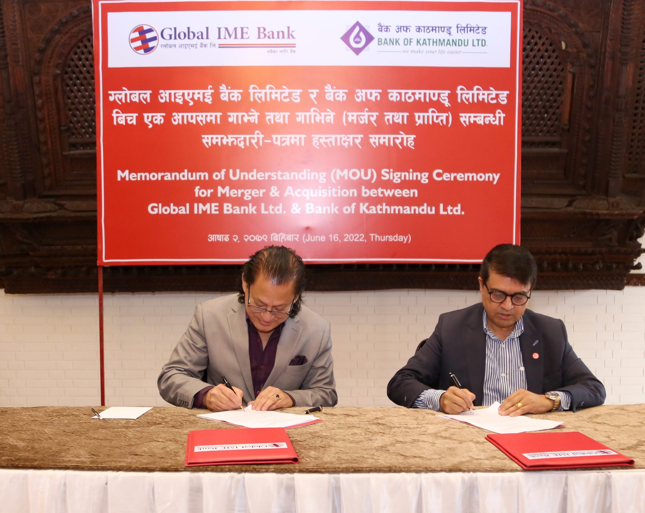 काठमाडौं । ग्लोबल आइएमई बैंक लिमिटेड र बैंक अफ काठमाण्डू लिमिटेडबीच गाभिएर बन्ने ग्लोबल आइएमई बिओके लिमिटेड मुलुककै सबैभन्दा ठूलो बैंक हुने भएको छ । बिहीबार दुई बैंकबीच एक एकको स्वाप रेसियो कायम गर्ने गरी एक आपसमा गाभ्न गाभिनको लागि प्रारम्भिक समझदारी भएको हो ।