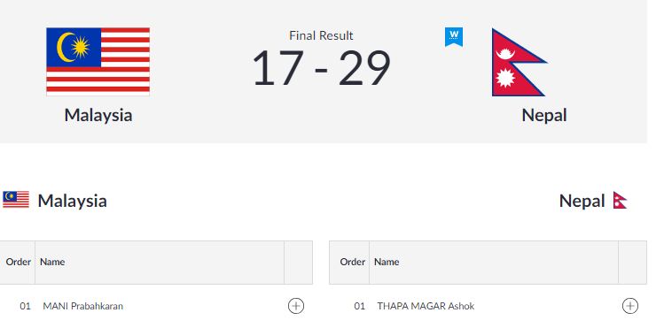 बुधवार भएको समूह ‘बी’ अन्तर्गतको चांैथो खेलमा नेपालले मलेसियालाई २९-१७ अंकले पराजित गरेको हो । शुरुवाती समयमा कडा टक्कर दिएको मलेसिया अन्ततः नेपालसामु निरिह साबित भयो ।