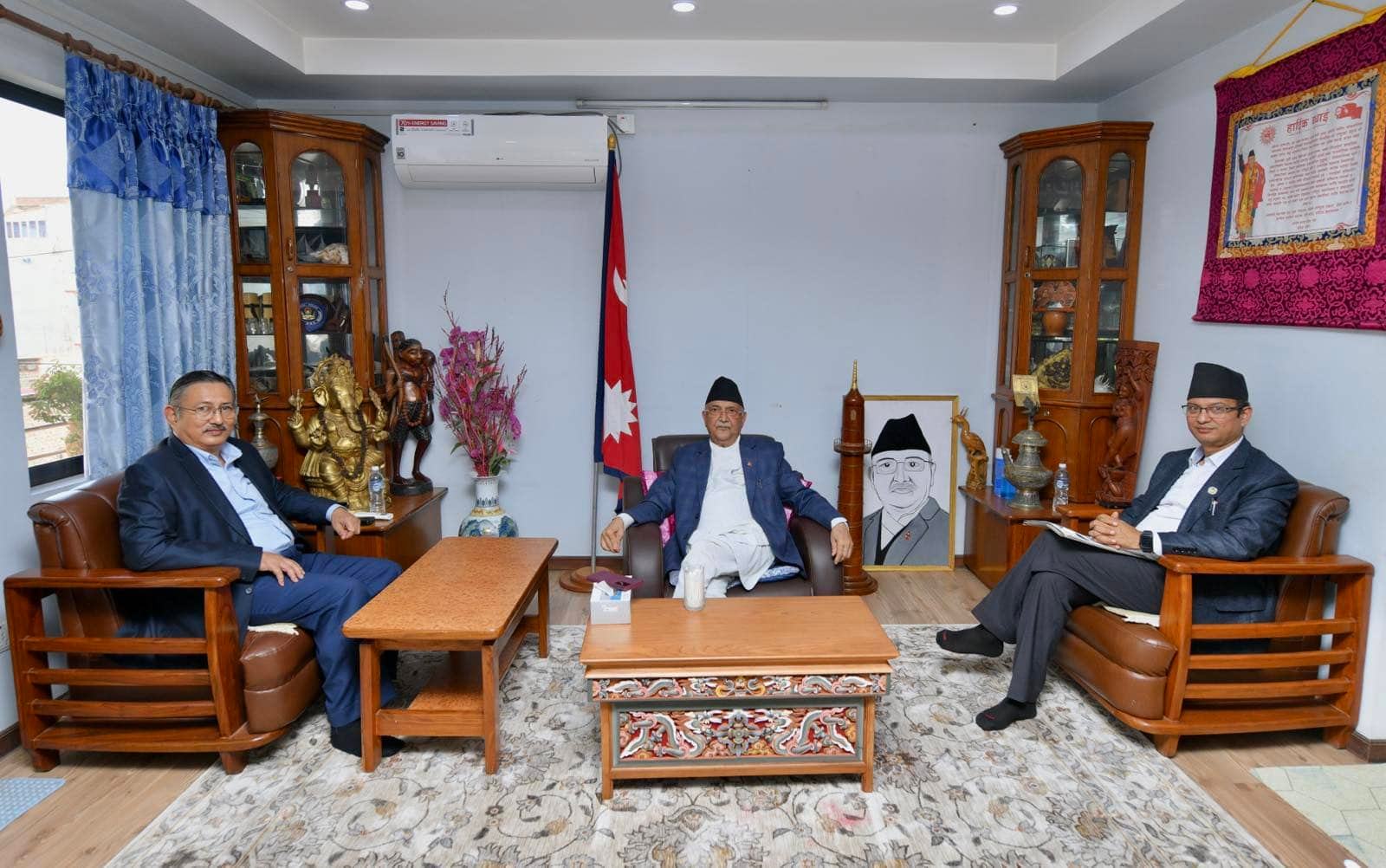 काठमाडौं । गृहमन्त्री बालकृष्ण खाँण र कानून मन्त्री गोविन्द बन्दी प्रमुख प्रतिपक्षी दल नेकपा एमालेका अध्यक्ष एवं पूर्व प्रधानमन्त्री अध्यक्ष केपी शर्मा ओलीसँग भेटघाट गरेका छन् ।