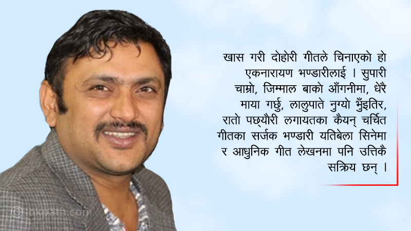 खास गरी दोहोरी गीतले चिनाएको हो एकनारायण भण्डारीलाई । सुपारी चाम्रो, जिम्माल बाको आँगनीमा, धेरै माया गर्छु, लालुपाते नुग्यो भुँइतिर, रातो पछ्यौरी लगायतका कैयन् चर्चित गीतका सर्जक एकनारायण भण्डारी यतिबेला भने सिनेमा र आधुनिक गीत लेखनमा पनि उत्तिकै सक्रिय छन् ।