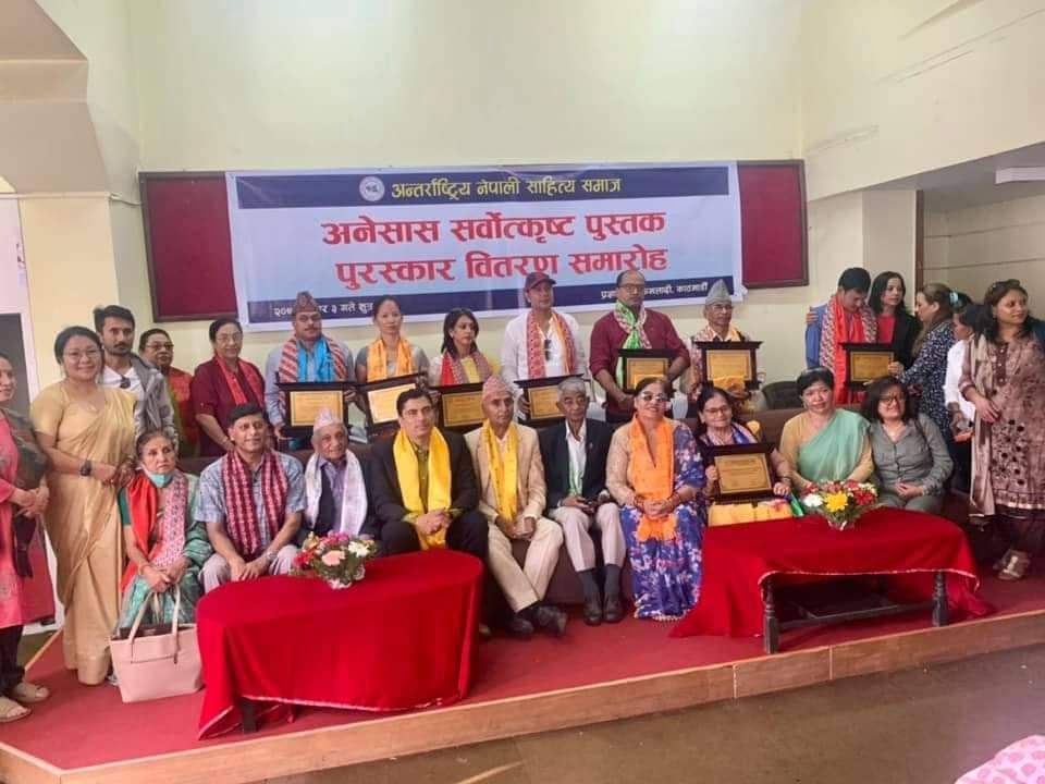 काठमाडौं । अन्तर्राष्ट्रिय नेपाली साहित्य समाज (अनेसास)ले प्रत्येक दुई वर्षमा प्रदान गर्दै आएको ‘अनेसास सर्वोत्कृष्ट पुस्तक पुरस्कार’ प्राप्त स्रष्टाहरूलाई प्रमाणपत्र र पुरस्कार राशि वितरण गरिएको छ । नेपाल नाट्य तथा सङ्गीत प्रतिष्ठानका कुलपति रायन श्रेष्ठको प्रमुख आतिथ्यतामा काठमाडौँस्थिति नेपाल प्रज्ञा प्रतिष्ठानमा आयोजित एक कार्यक्रमका बिच ‘अनेसास सर्वोत्कृष्ट पुस्तक पुरस्कार’ ११ पुरस्कृत स्रष्टाहरूलाई वितरण गरिएको हो ।