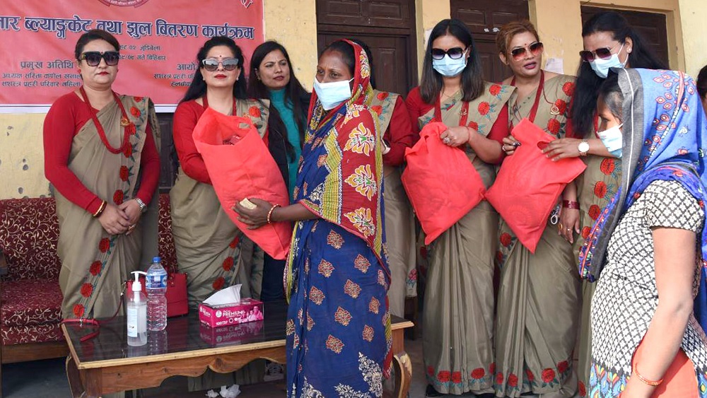 काठमाडौंस्थित फिटवेल गार्मेन्टको सहयोगमा सशस्त्र प्रहरी परिवार महिला संघकी केन्द्रीय अध्यक्ष अनिता लामिछाने (अर्याल) ले निजगढ, कोल्हबी नगरपालिका र करैयामाई गाउँपालिकाका एक हजार ५० गरिव र विपन्न प्रतिपरिवार तीन थान झुल र एक थान पोलार ब्ल्याङ्केटसहितको राहत प्याकेट वितरण गरेकी हुन् ।