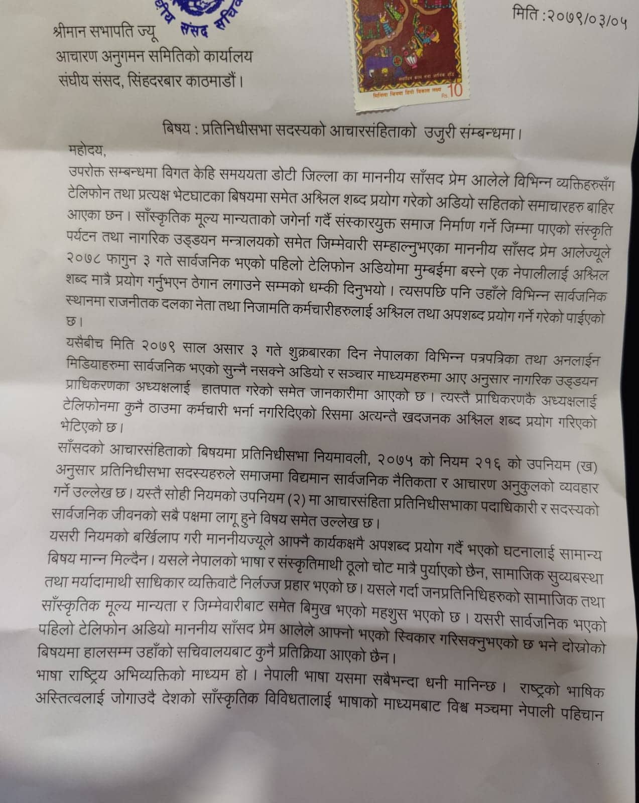 काठमाडौं । संसदको चारण अनुगमन समितिको कार्यालय संघीय संसद, सिंहदरवारमा संस्कृति पर्यटन तथा नागरिक उड्डयनमन्त्री प्रेम आलेविरुद्ध उजुरी परेको छ । आलेले प्रतिनिधिसभा सदस्यको आचारसंहिताविपरित गतिविधि गरेको भन्दै उनीमाथि कारबाहीको मागसहित उजुरी परेको हो ।