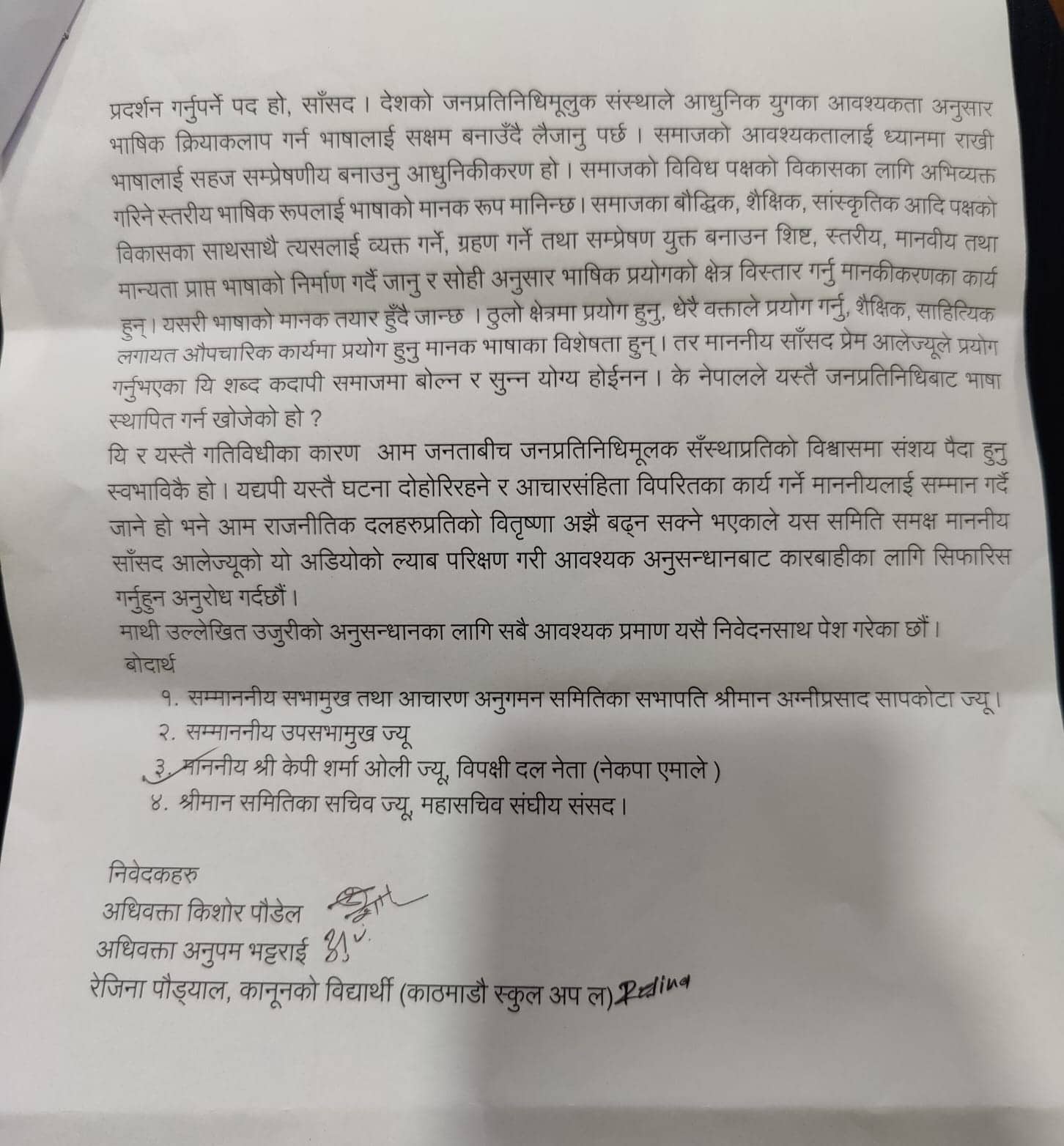 उजुरीमा भनिएको छ, ‘डोटीका माननीय सांसद प्रेम आलेले विभिन्न व्यक्तिसँग टेलिफोन तथा प्रत्यक्ष भेटघाटका बिषयमा अश्लिल शब्द प्रयोग गरेको अडियो बाहिर आएका छन् । साँस्कृतिक मूल्य मान्यताको जगेर्ना गर्दै संस्कारयुक्त समाज निर्माण गर्ने जिम्मा पाएको संस्कृति पर्यटन तथा नागरिक उड्डयन मन्त्रालयको जिम्मेवारी सम्हाल्नुभएका आलेज्यूले टेलिफोन वार्ताहरुमा अश्लिल शब्द मात्रै प्रयोग गर्नु भएन ठेगान लगाउने सम्मको धम्की दिनुभयो ।’
