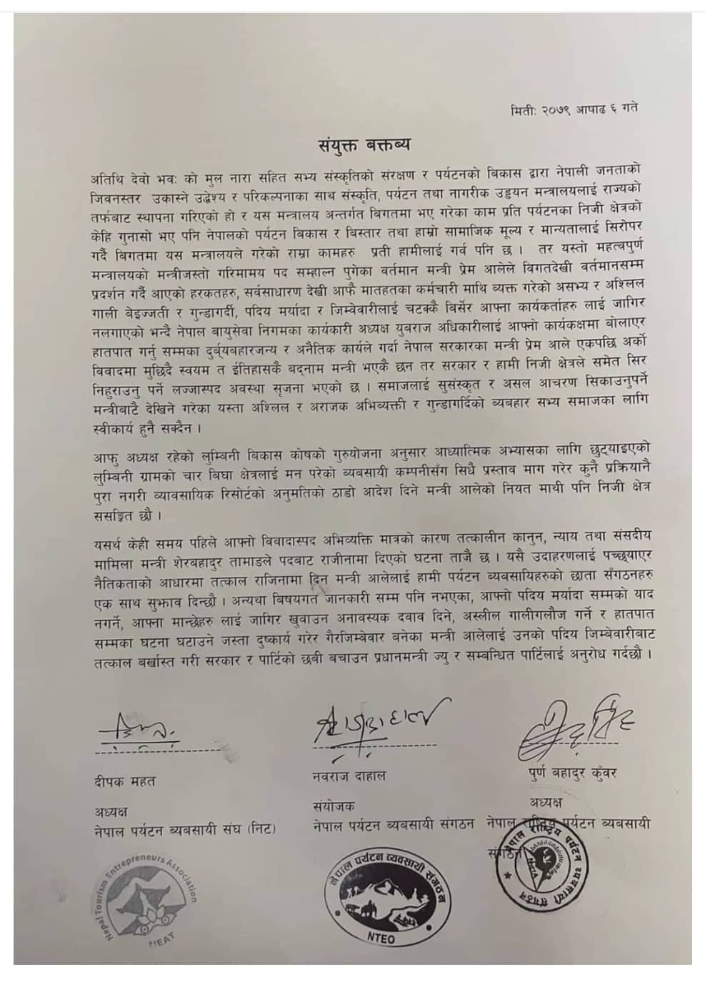 नेपाल पर्यटन व्यसायी संघ (निट), नेपाल पर्यटन व्यवसायी संगठन र नेपाल राष्ट्रिय पर्यटन व्यवसायीले सोमबार संयुक्त रुपमा विज्ञप्ती जारी गर्दै मन्त्री आलेलाई हटाउन प्रधानमन्त्री शेरबहादुर देउवासमक्ष आग्रह गरेका हुन् ।