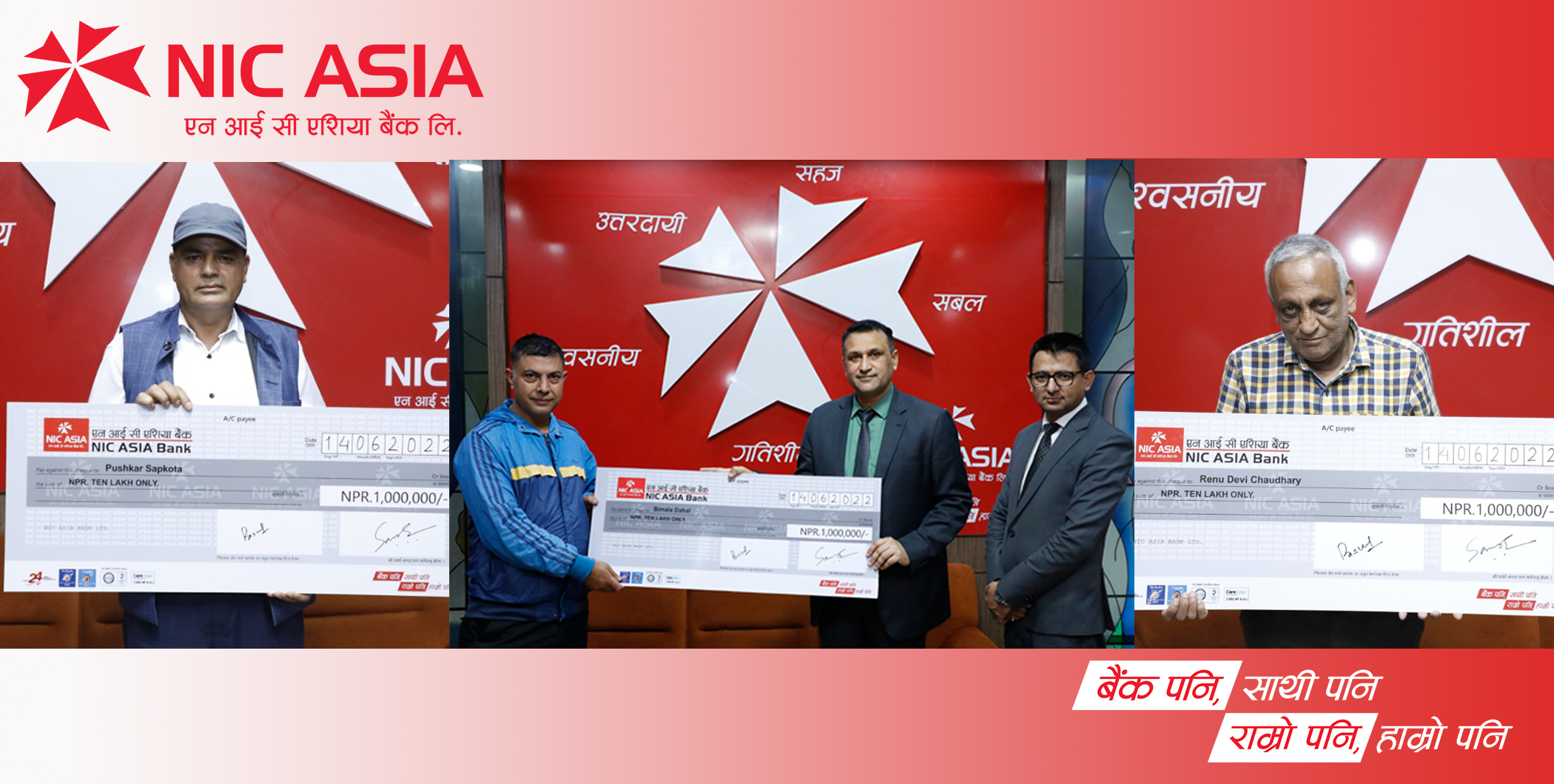 काठमाडौं । एनआईसी एशिया बैंकले ‘सर्वश्रेष्ठ बचत खाता’ तथा ‘न्यू प्रिमियम सुपर चमत्कारिक बचत खाता’ योजनाअन्तर्गत बैंकमा उक्त बचत खाता खोलेका तीन जना ग्राहकहरुलाई घातक रोगको बीमा बापत प्रतिव्यक्ति १० रुपैयाँका दरले कुल ३० लाख रुपैयाँ भुक्तानी गरेको छ ।