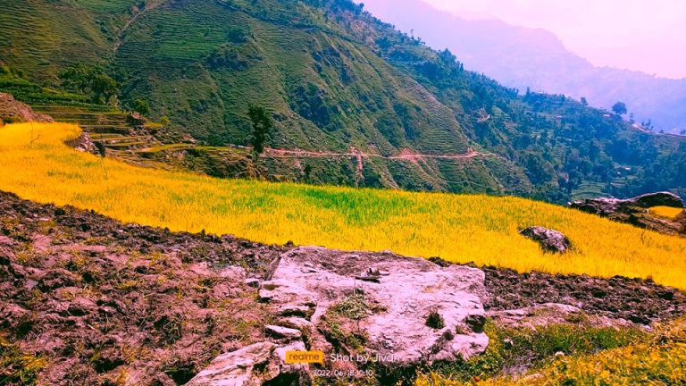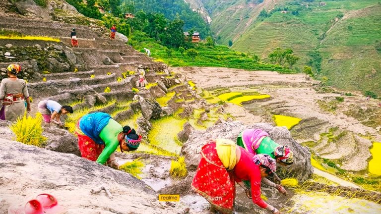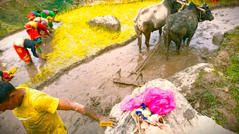 दैलेखको ठाटीकाँध गाउँपालिका-१ खातीगाउँ सीमधारास्थित खेत रोप्दै रोप्नेरी बाउसे ।
