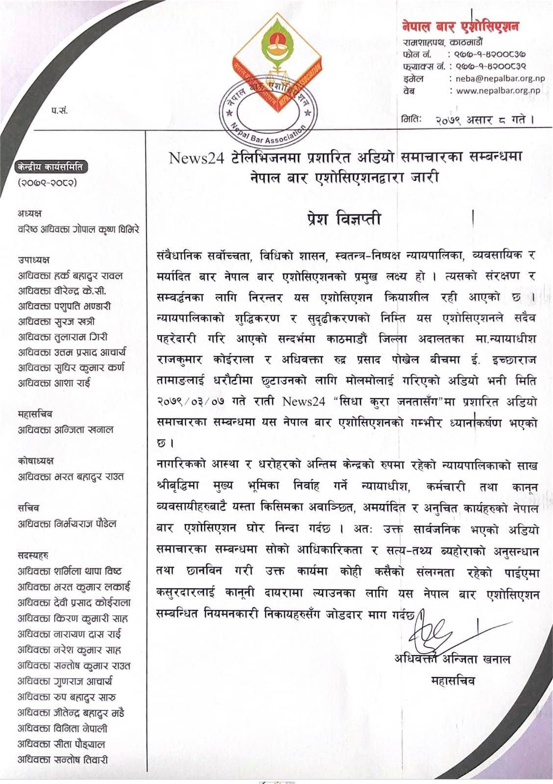 बुधबार नेपाल बारकी महासचिव अञ्जिता खनालले जारी गरेको विज्ञप्तिमा अडियो समाचारका सम्बन्धमा त्यसको आधिकारिकता र सत्य तथ्य व्यहोरोको छानबिन गरी त्यसमा कोही कसै संलग्नता पाइएमा कारबाही गर्न माग गरिएको छ ।