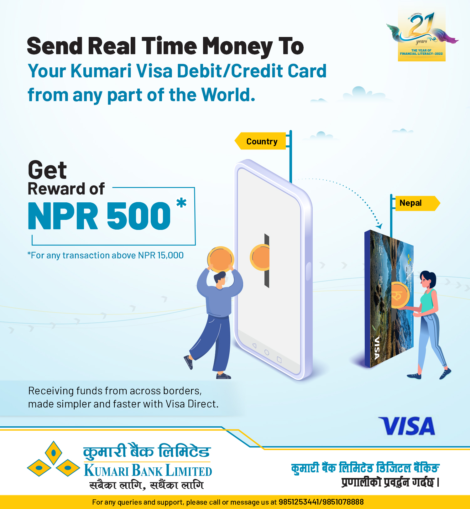 कुमारी बैंकको भिसा डेबिट/क्रेडिट कार्डमा विदेशबाट रकम प्राप्त गर्न सकिने