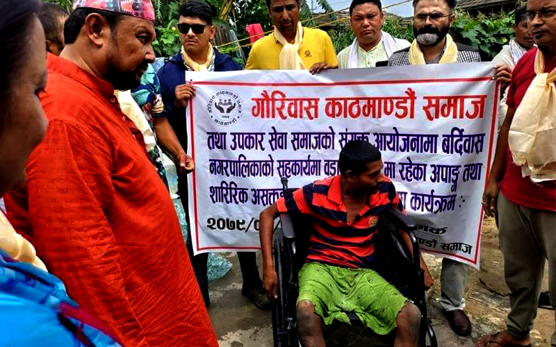 ‘शरीरिकरूपमा अपाङ्गा भोगिरहेकाहरूको मार्कालाई मध्यनजर गर्दै ह्विलचियर प्रदान गर्ने निर्णय गरेका हौँ ।’ गौरीवास–काठमाडौं समाजका अध्यक्ष कृष्ण घिमिरेले भने । सर्पले डसेका बिरामी र अन्य रोग तथा इमर्जेन्सी उपचारका लागि सर्पदंश उपचार केन्द्र बर्दिबासलाई समेत समाजले एम्बुलेन्स प्रदान गरेको छ ।