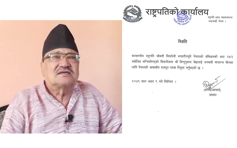 नेपालको संविधानको धारा २८२ बमोजिम मन्त्रिपरिषद्‍को सिफारिसमा आज राष्ट्रपति विद्यादेवी भण्डारीले चीनका लागि नेपाली राजदूतमा श्रेष्ठलाई नियुक्त गरेकी हुन् ।