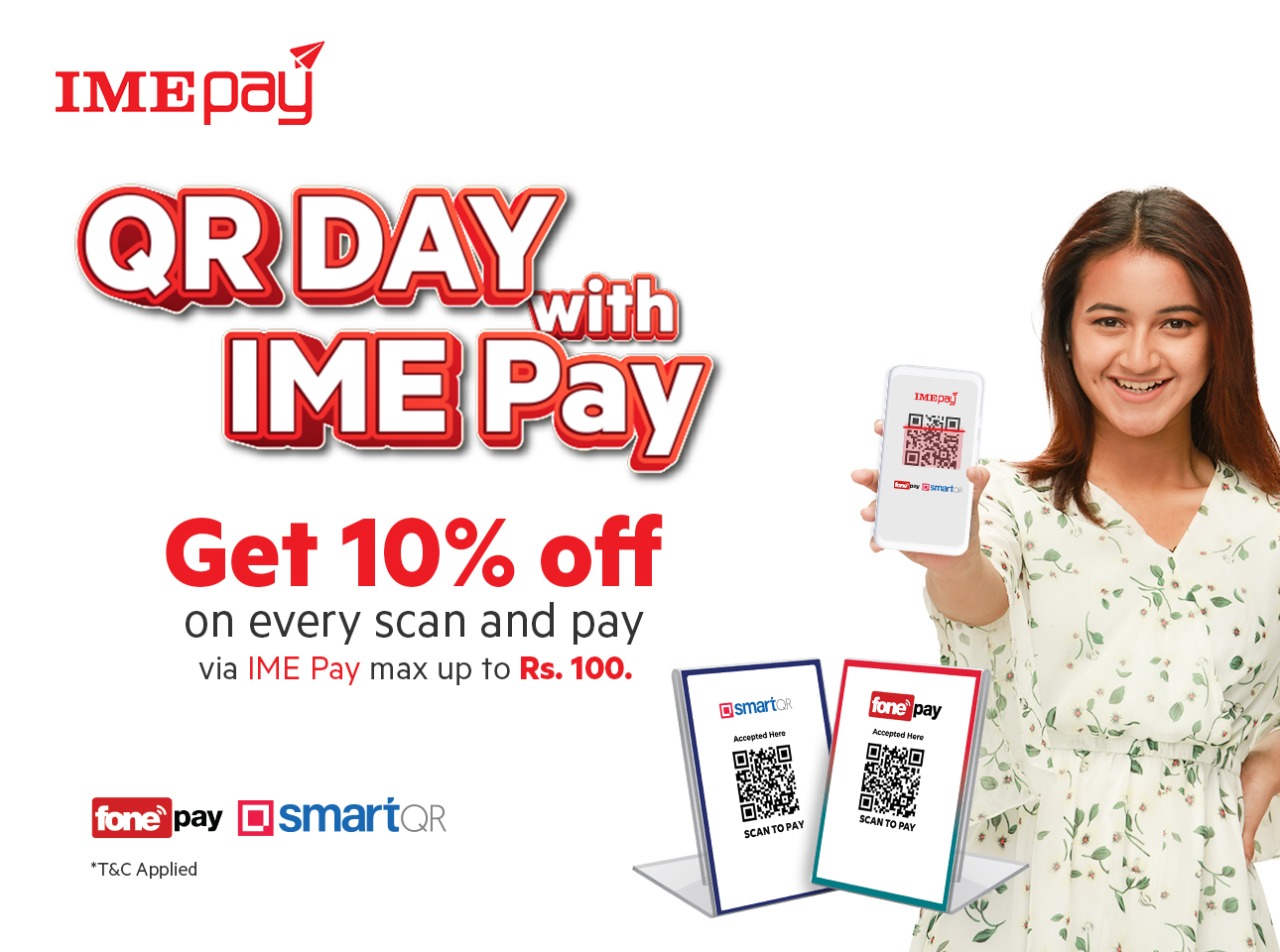 आइएमई ग्रुपद्वारा संचालित आइएमई डिजिटल सोलुसन लिमिटेडद्वारा प्रवर्द्धित “आइएमई पे” ले प्रयोगकर्ता माझ ‘क्यूआर डे विथ आइएमई पे’ अफर सार्वजनिक गरेको छ । यस अफर अन्तर्गत सबै प्रयोगकर्ताहरुले कुनै पनि क्यूआर पेमेन्ट आइएमई पे एपमार्फत भुत्तानी गर्दा दिनभरीमा १० प्रतिशत छुट (अधिकतम एक सय रुपैंयाँसम्म) प्राप्त गर्ने व्यवस्था मिलाइएको कम्पनीले जानकारी दिएको छ ।